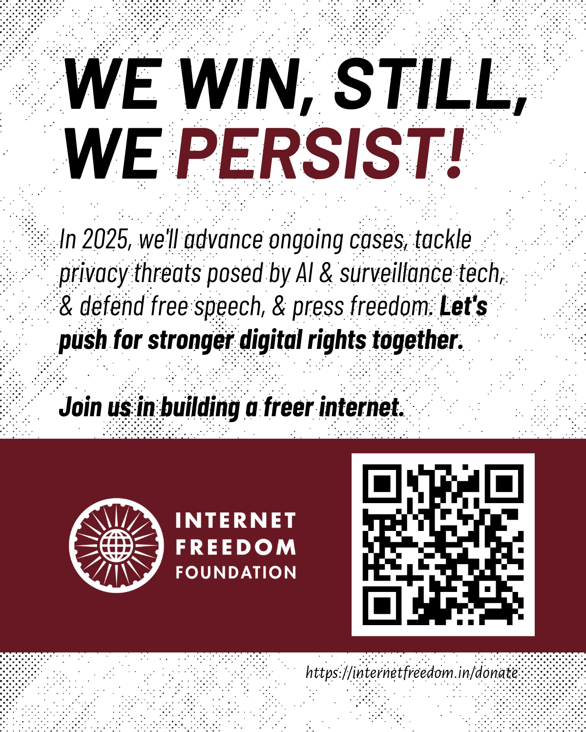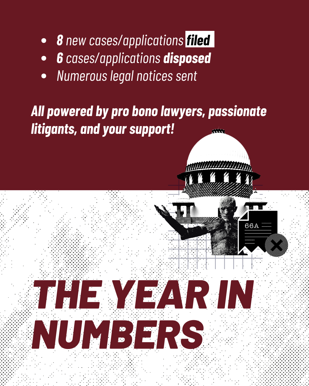 Our work is driven by a multi-faceted strategy that integrates legal action, public advocacy, expert collaboration, policy engagement, and RTI-based accountability. As technology continues to reshape society, judicial intervention remains a cornerstone of our efforts to safeguard individual rights. We invite you to share your feedback and priorities for 2025 by writing to us at [email protected].