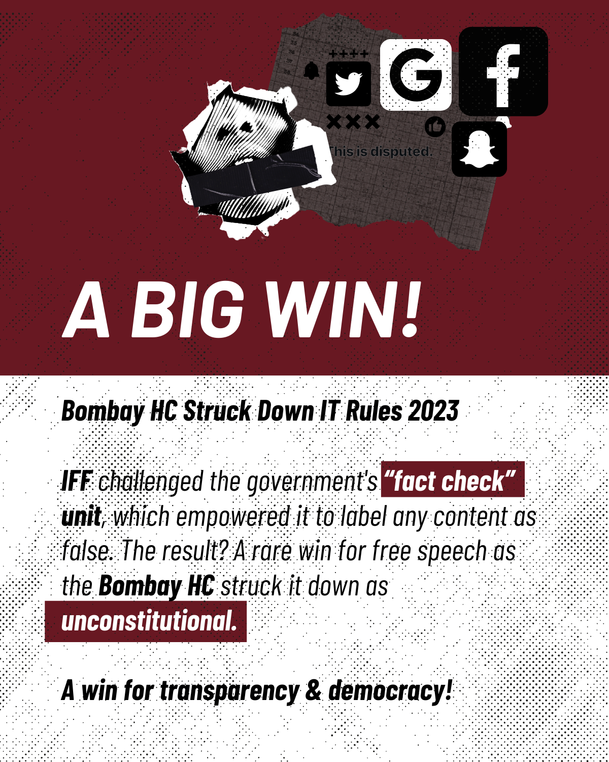 - IFF’s Response: IFF assisted two petitioners—satirist Kunal Kamra and the Association of Indian Magazines (AIM)—in challenging the IT Rules 2023 before the Bombay High Court. The court delivered a split verdict, and during the pendency of the challenge, the Union Government gave an undertaking not to operationalise the FCU, effectively staying its operation. On 31 January 2024, Justice Gautam Patel and Justice Neela Goakhale delivered a split verdict. The matter was subsequently referred to a third judge. However, after the split verdict, the government did not extend this undertaking indefinitely.