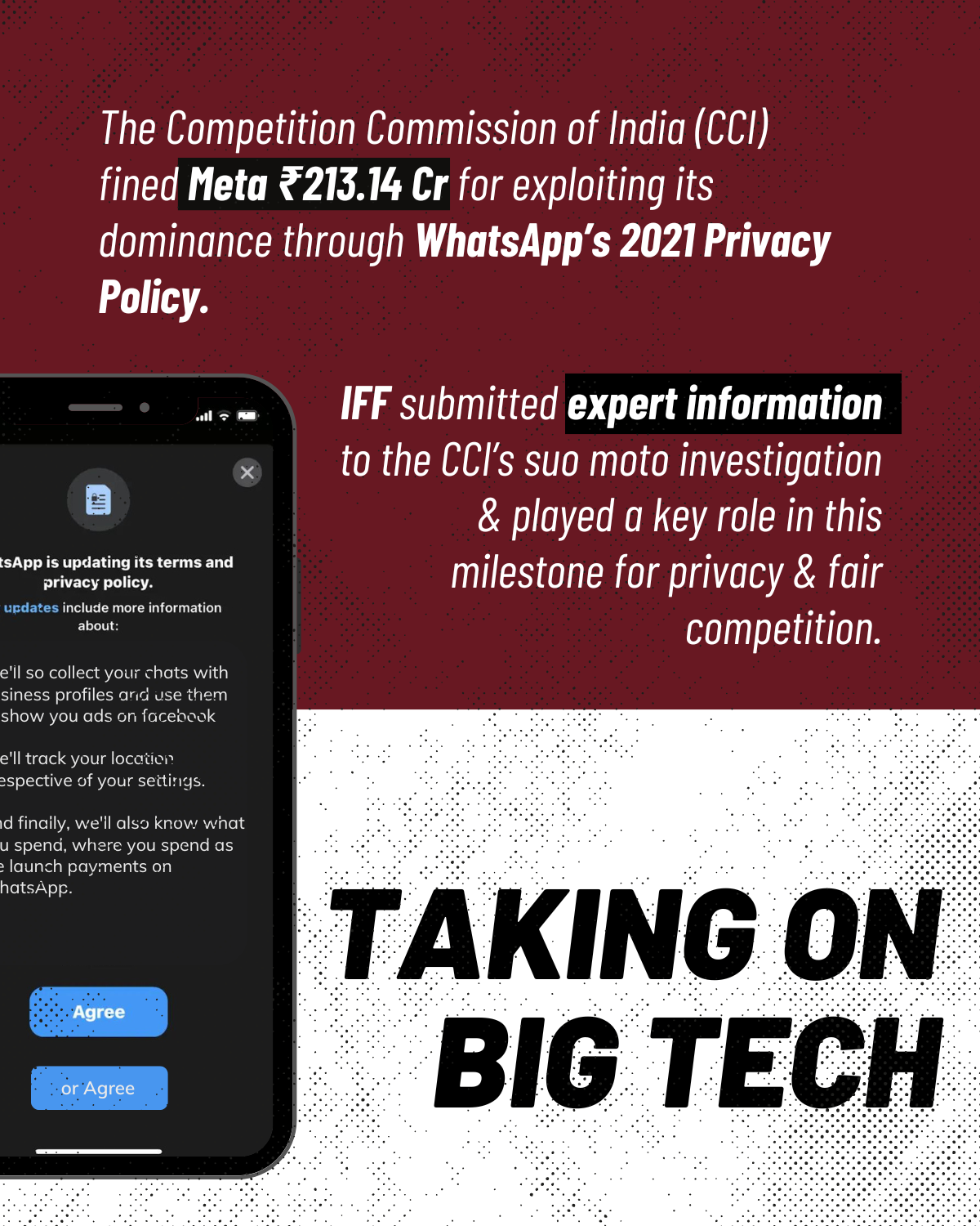 - IFF’s Response: In October 2021, IFF submitted expert information to the CCI’s suo moto investigation into WhatsApp’s anti-competitive practices. Our submission highlighted how WhatsApp’s 2021 Privacy Policy enabled data sharing with Facebook Inc. (now Meta) and its subsidiaries, raising concerns of abuse of dominance. This was IFF’s first matter before the CCI.