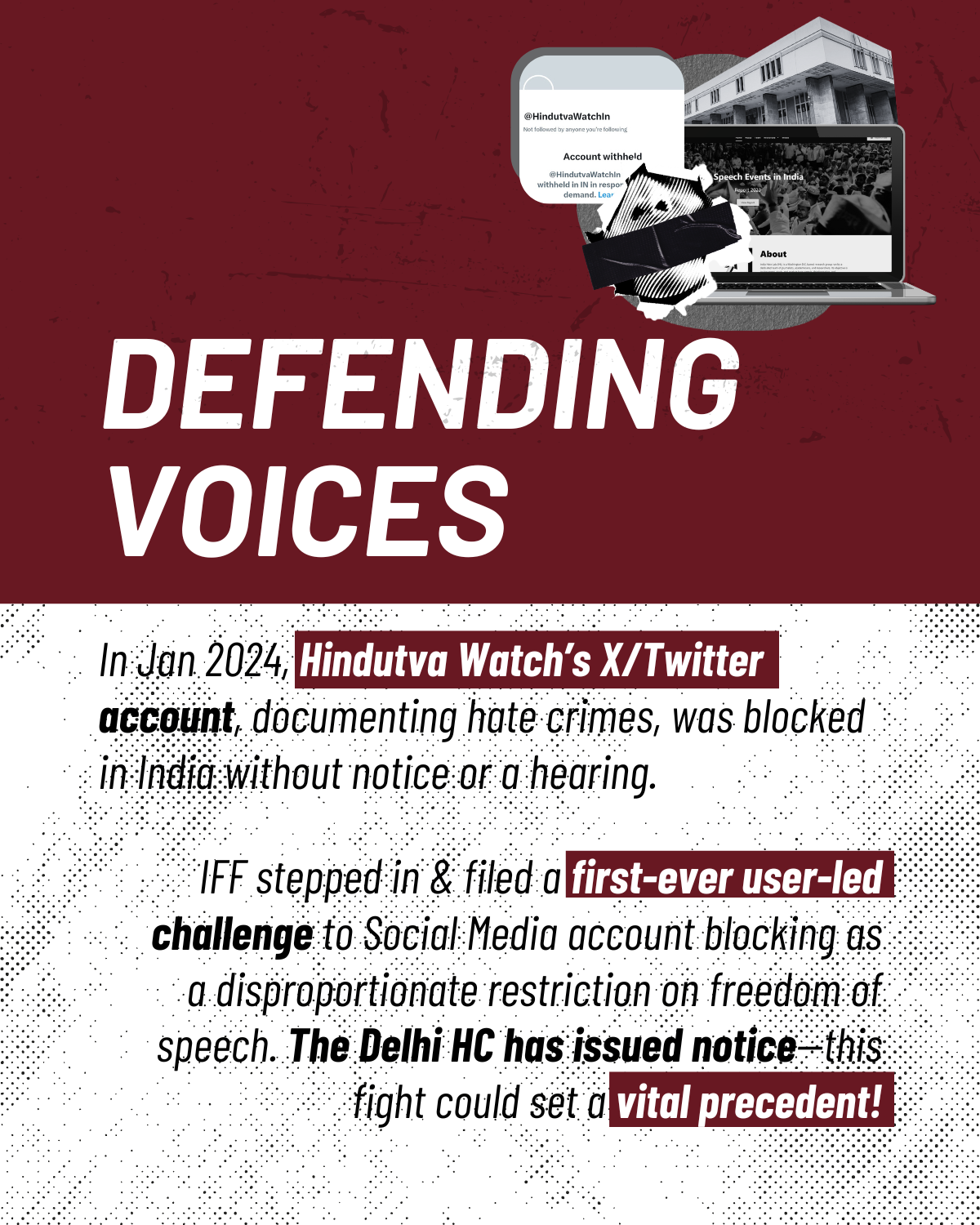 - IFF’s Response: IFF filed a writ petition before the Delhi High Court on behalf of the founder of Hindutva Watch, challenging the wholesale account blocking as a disproportionate restriction on freedom of speech under Article 19(1)(a) and an unconstitutional prior restraint. The petition argued that the blocking order violated natural justice, disregarded the Supreme Court’s ruling in Shreya Singhal v. Union of India, and failed to comply with Section 69A of the IT Act, the 2009 Blocking Rules, and the proportionality test.