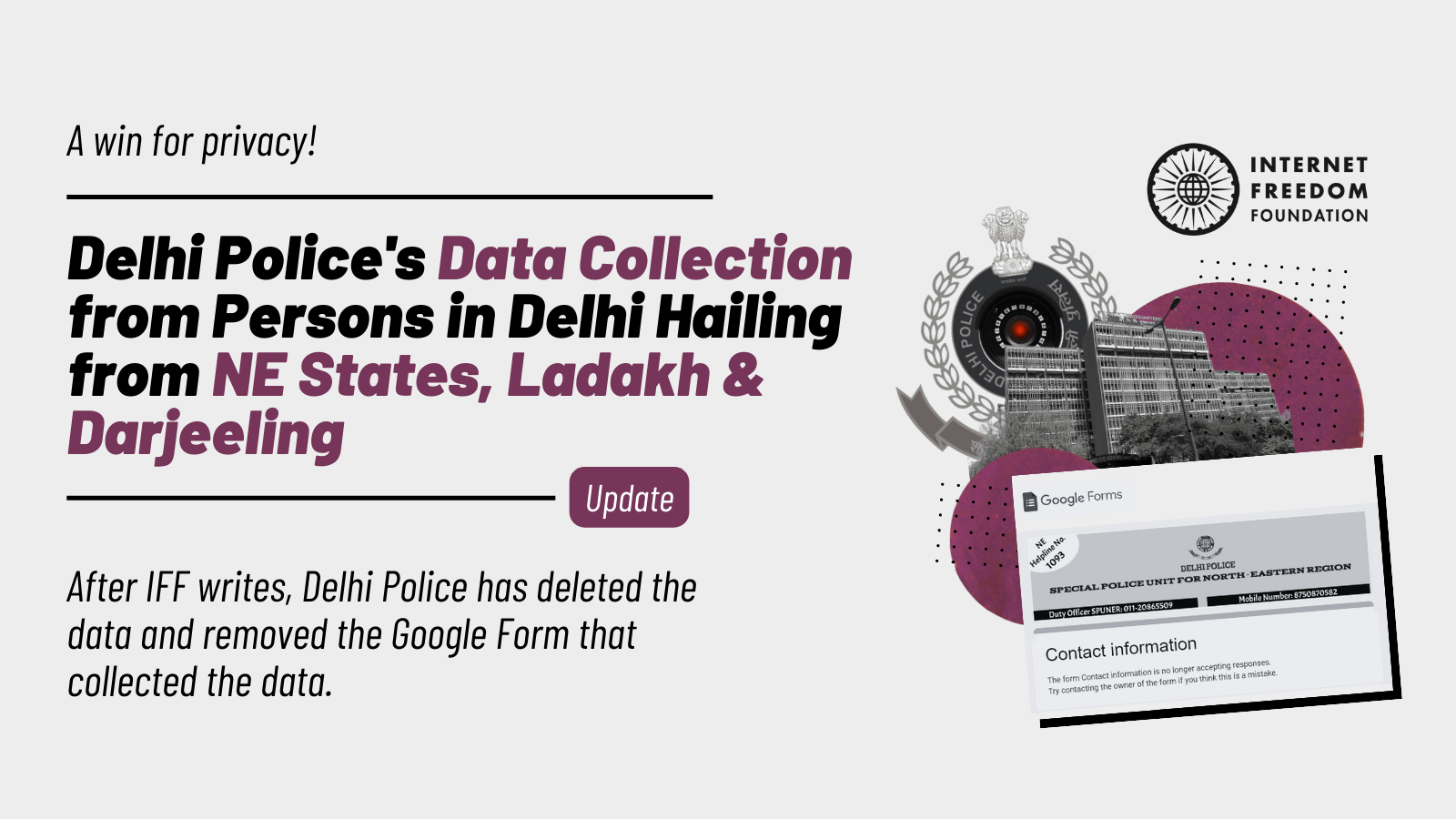 After IFF writes to the Delhi Police Commissioner, Delhi Police has deleted the data and removed the Google Form that collected data from Delhi’s residents hailing from NE States, Darjeeling and Ladakh