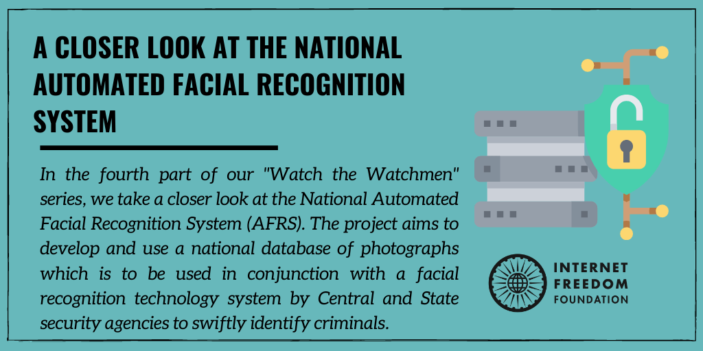 IFF has been tracking the RFP for AFRS since last year and has sent two legal notices to the NCRB pertaining to its illegality (Read here and here). Additionally, under our Project Panoptic, we have also been tracking all other instances of facial recognition use in the country that we have come across. Our main aim behind this project is to increase transparency and accountability from the authorities who are implementing these projects.