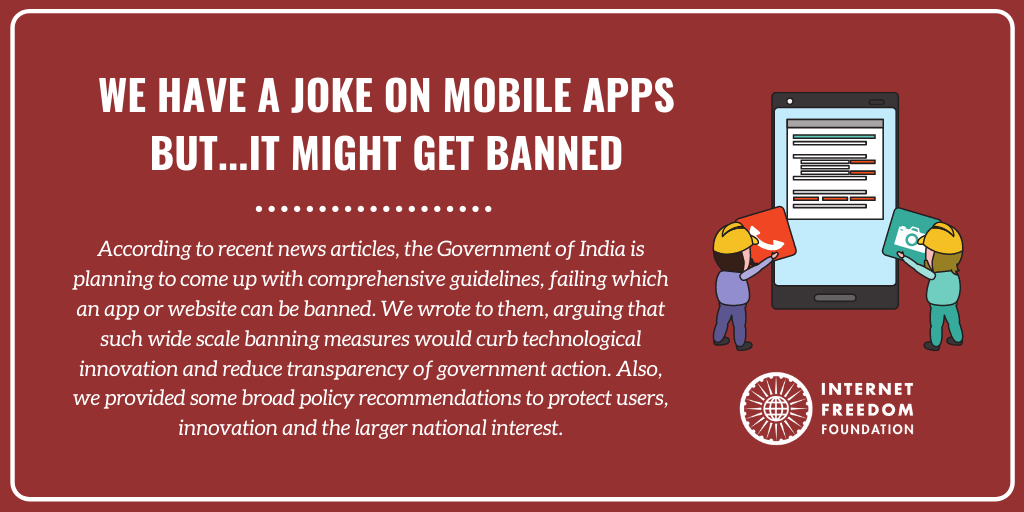 As per news reports a coordinated effort is underway by the Government of India to strengthen its stance on banning mobile apps. According to a senior government official and other sources in the government, the GoI is planning to come out with guidelines, flouting which any app can be banned. Such wide scale banning would undermine nuanced policy approaches for protecting the digital rights of the citizens. We have some alternatives and suggestions to protect users, innovation and the larger national interest. So, we wrote to the Ministry of Electronics and Information Technology (MeitY) urging them to develop a transparent cybersecurity policy, and asking them to expedite the work on the Personal Data Protection Bill.