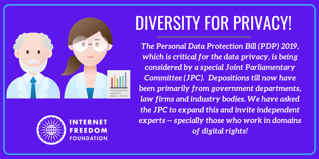 The Personal Data Protection Bill (PDP) 2019, which is critical for the data privacy, is being considered by a special Joint Parliamentary Committee (JPC). While the JPC has picked up pace in the last few weeks, the initial depositions have primarily focussed on engagement with government bodies and industry experts. We believe this needs to change and have urged the committee to invite a diverse range of stakeholders for depositions. Without it, conscious drafting choices against the interests of citizens contained in the PDP Bill run the risk of avoiding proper scrutiny. Today we wrote the JPC to consider widening participation and bringing a diverse range of independent voices to depose before it.
