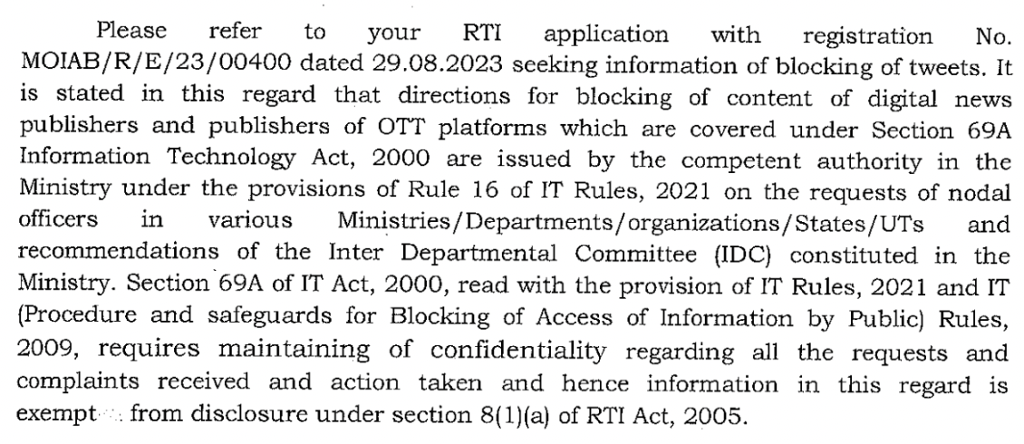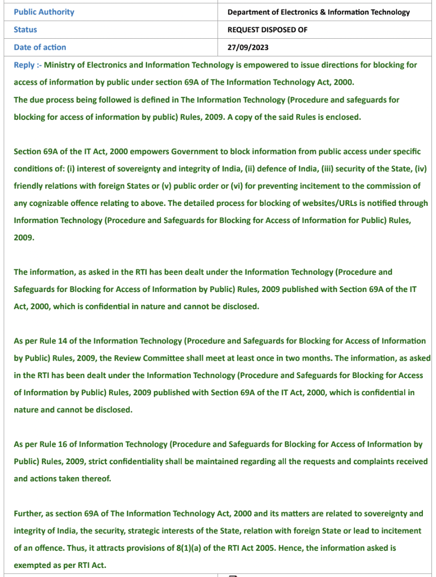 MIB, on the other hand, similarly admitted that it had ordered the censorship under Rule 16 of the Information Technology (Intermediary Guidelines and Digital Media Ethics Code) Rules, 2021 (IT Rules, 2021). It also claimed that S.69A of the IT Act and the 2009 Blocking Rules, 2009 require maintaining confidentiality, and rejected our RTI request under S.8(1)(a) of the RTI Act.