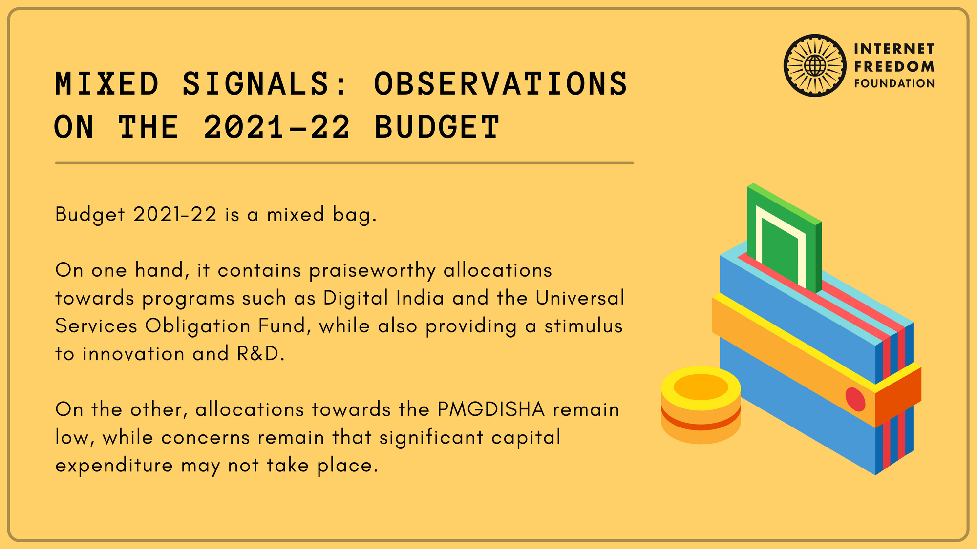Budget 2021-22 is a mixed bag. On one hand, it contains eminently praiseworthy allocations towards programs such as Digital India and the Universal Services Obligation Fund while also providing a stimulus to innovation and R&D; on the other, allocations towards the PMGDISHA remain low, while concerns remain that significant capital expenditure may not take place.