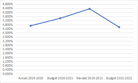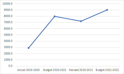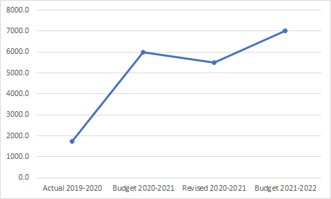 - For the Department of Telecommunications, this is a 43% increase over the Revised Estimates of 2020-21, which were a 45% increase over the actual spending for 2019-20. The Revised Estimates were 38.1% less than the Budget Estimates in 2020-21.
