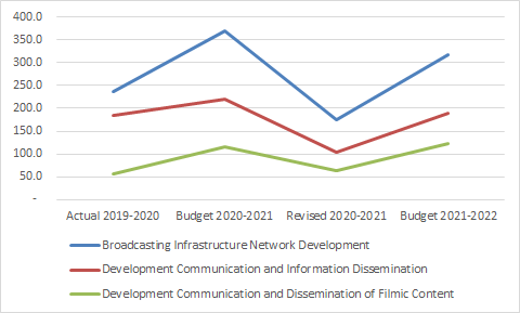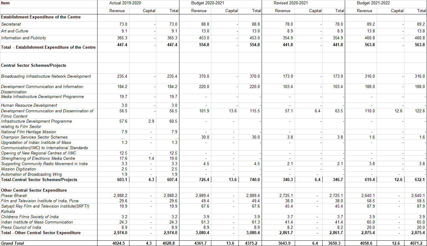 The main thrust of the increase under the expenditure on schemes comes from three budget heads: Broadcasting Infrastructure Network Development, Development Communication and Information Dissemination, and Development Communication and Dissemination of Filmic Content.