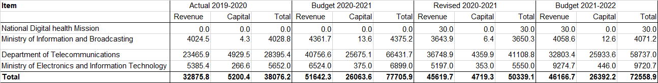 Budget 2021-22 has cumulatively allotted Rs. 72,558.9 crore to the National Digital Health Mission, the Ministry of Electronics and Information Technology, the Ministry of Information and Broadcasting, and the Department of Telecommunications: