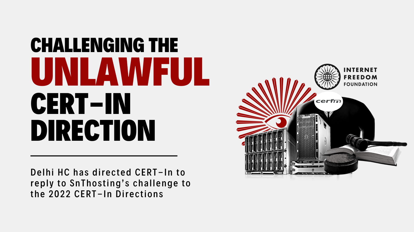 The Delhi HC has issued notice in a petition filed by SnTHostings challenging the legality of Direction No. 20(3)/2022-CERT-In dated April 28, 2022 (‘2022 Directions’) by the The Indian Computer Emergency Response Team (‘CERT-In’). SnTHostings provides hosting, Virtual Private Network (‘VPN’) and Virtual Private Server (‘VPS’) services. The 2022 Directions presented an existential crisis to SnTHostings as they mandated it to collect a range of personal data and share it with CERT-In on demand and / or on the occurrence of a cyber-security incident. Mr. Samar Bansal appeared on behalf of SnTHosting. Justice Yashwant Verma of the Delhi HC heard detailed submissions from the counsel and directed CERT-In to provide a response to the Petition, stating that the issue requires consideration. IFF provided legal assistance.