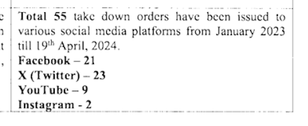 On April 19, 2024, we filed seven separate RTIs with the ECI regarding the content takedown orders issued to ByteDance, Facebook, Google, ShareChat, X, and WhatsApp. In the interest of due diligence, we also filed an RTI seeking statistical information on the content takedown orders to all the social media platforms from 01.01.2023 until the receipt of the RTIs. Almost a month later, the ECI in its response stated that they issued 55 takedown orders, providing concurring information in the social media platform-specific RTIs as well.