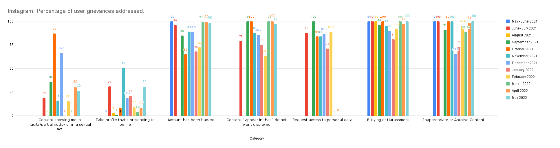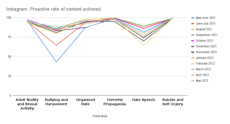 Meta (Facebook and Instagram) has not changed the metrics adopted for reporting proactive takedowns, despite disclosures made by Frances Haugen. In its report, Meta adopts the metrics of (i) ‘content actioned’ which measures the number of pieces of content (such as posts, photos, videos or comments) that they take action on for going against their standards and guidelines; and (ii) proactive rate which refers to the percentage of ‘content actioned’ that they detected proactively before any user reported the same. This metric is misleading because the proactive rate is measured as a percentage of only that content on which action was taken (either proactively or on the basis of user complaint). It does not show what percentage of all content on Facebook (which may otherwise be an area of concern but not flagged by users) was proactively taken down. Such a metric neither reflects the efficiency of the proactive takedown mechanism nor discloses the process followed for undertaking automated takedowns. We have written more about this in our previous post.