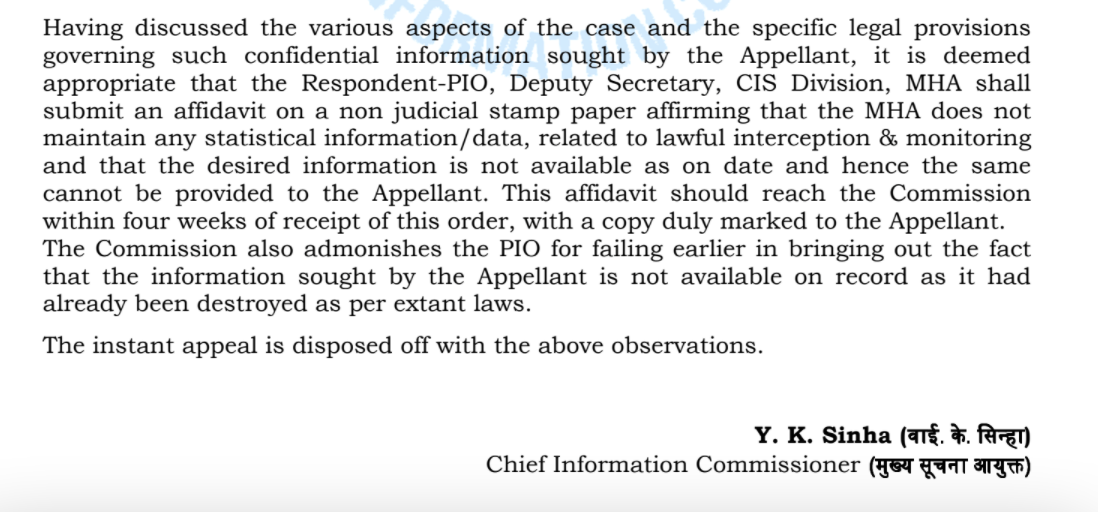The MHA denied the information again - this time on the new ground that it did not maintain any statistical data on e-surveillance at all! We went back to the CIC on appeal. On January 28, 2022, the CIC issued an order requiring the Central Public Information Officer (‘CPIO’) to submit an affidavit recording his claim of non-availability of data. The CIC also admonished the CPIO for belatedly raising his claim that no data is available