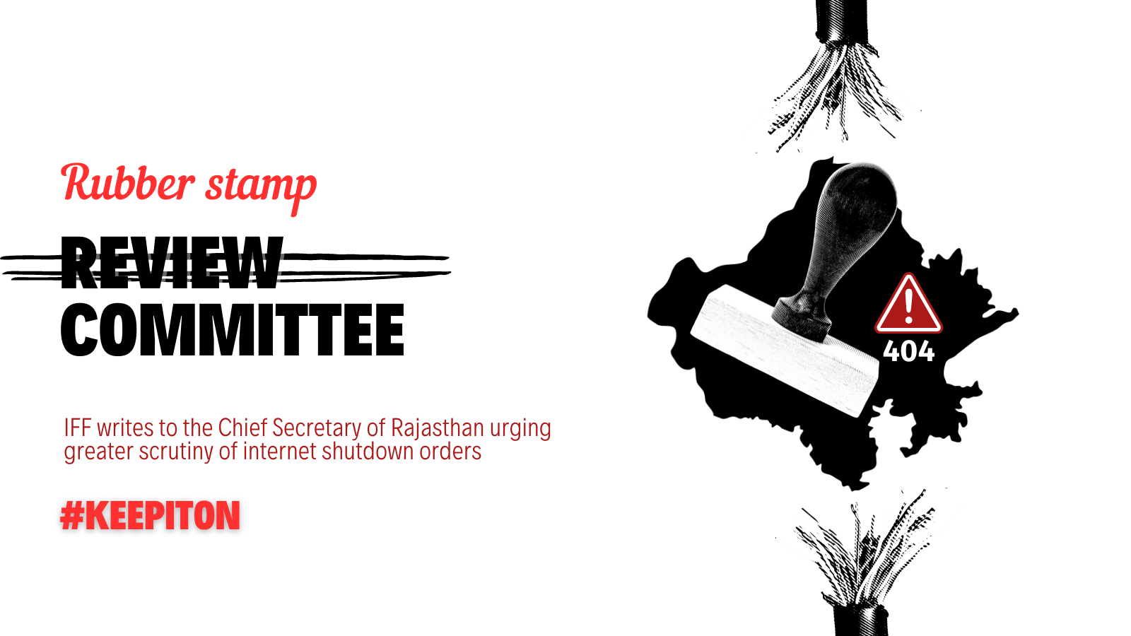 Remember the Rajasthan Government’s response to our RTI, where it admitted that Rajasthan’s Review Committee does not meet to review internet shutdown orders, and only confirms them by circulation? Applicable Indian law requires governments to publish all internet shutdown orders in the public domain, and these orders must be reviewed by a committee of high-level government officials, to ensure that they are proportionate, lawful and necessary. We found Rajasthan government’s Review Committee procedures concerning and have written to the Chairperson of the Review Committee, i.e. the Chief Justice of Rajasthan urging greater scrutiny of shutdown orders.