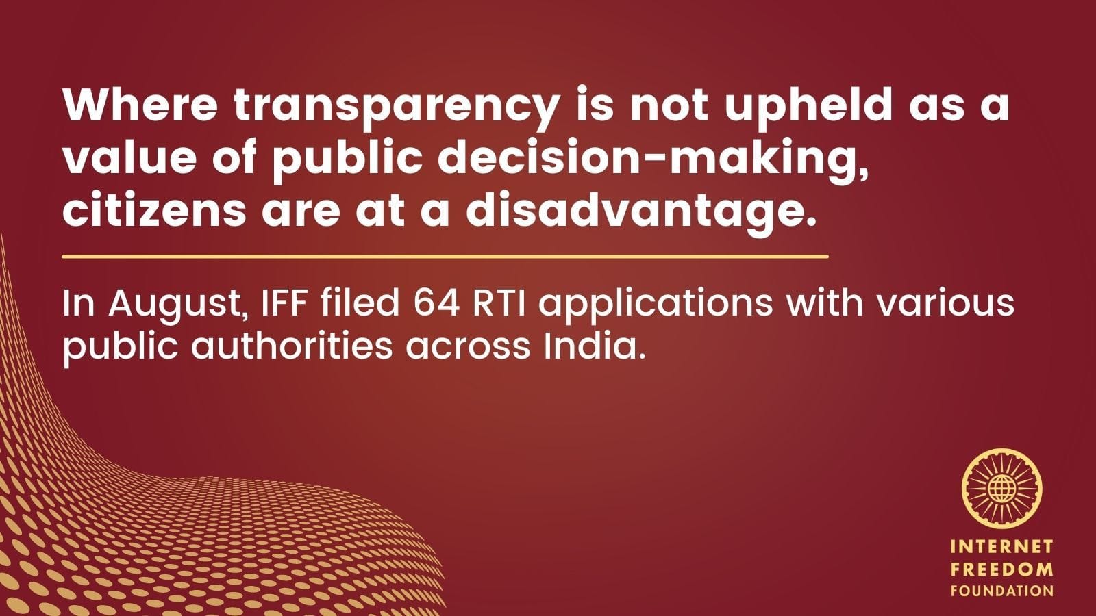 Since our last report for the month of July, IFF has filed 64 RTI requests, 5 First Appeals and 1 Second Appeal. Here, we give you an overview of the requests filed and an analysis of the responses we have received from the different public authorities. This report highlights why demanding transparency and accountability from Government authorities is one of the key elements in our fight to protect digital rights.