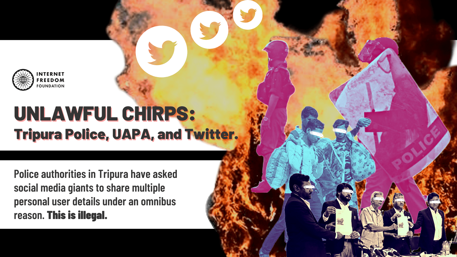 On November 3, 2021, in connection with a case registered under the stringent Unlawful Activities Prevention Act, 1967, the West Agartala Police issued a notice to Twitter Inc under Section 91 of the Code of Criminal Procedure. By way of the notice, the Police directed Twitter Inc. to block 68 Twitter pages/accounts and sought information related to them, including personal information such as browsing details and user registration details. We wrote to the Police pointing out that the notice dated November 3, 2021, is vague and that the Police is not empowered to direct blocking of pages/accounts on Twitter. We have sought immediate withdrawal of the notice.