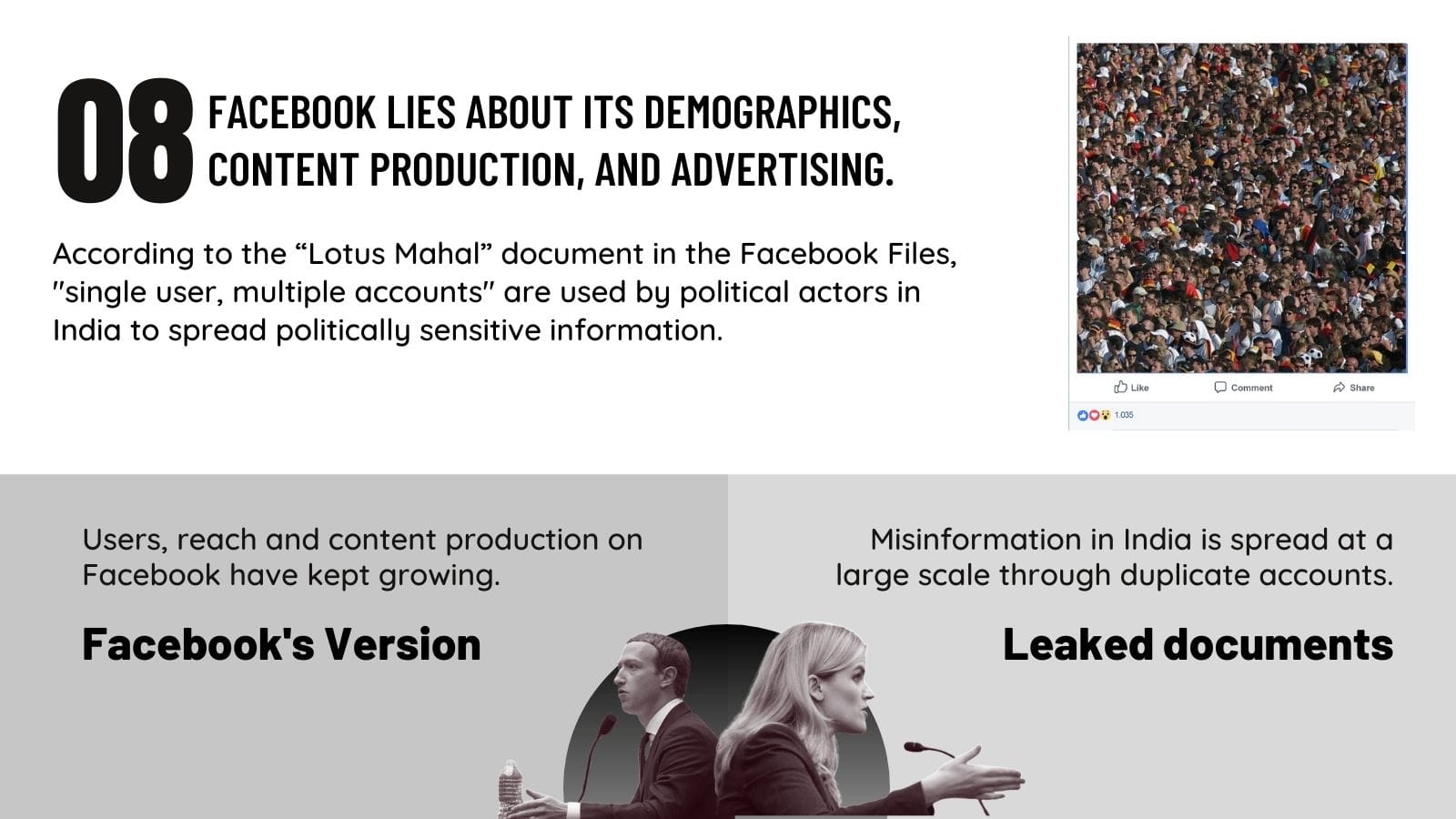 Misinformation is also spread at a large scale in India through duplicate accounts or SUMA, which stands for “single user, multiple accounts”. The complaint also claims that for years, Facebook has misrepresented its true number of individual users to advertisers, not properly accounting for "single users with multiple accounts". According to a document referred to as “Lotus Mahal” in the complaints filed, such accounts are used by political actors in India to spread politically sensitive information.