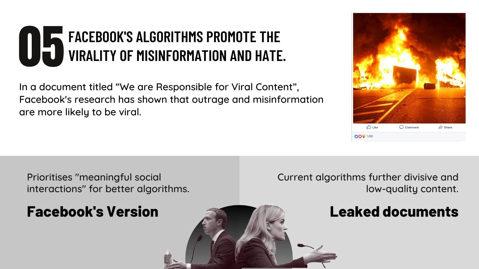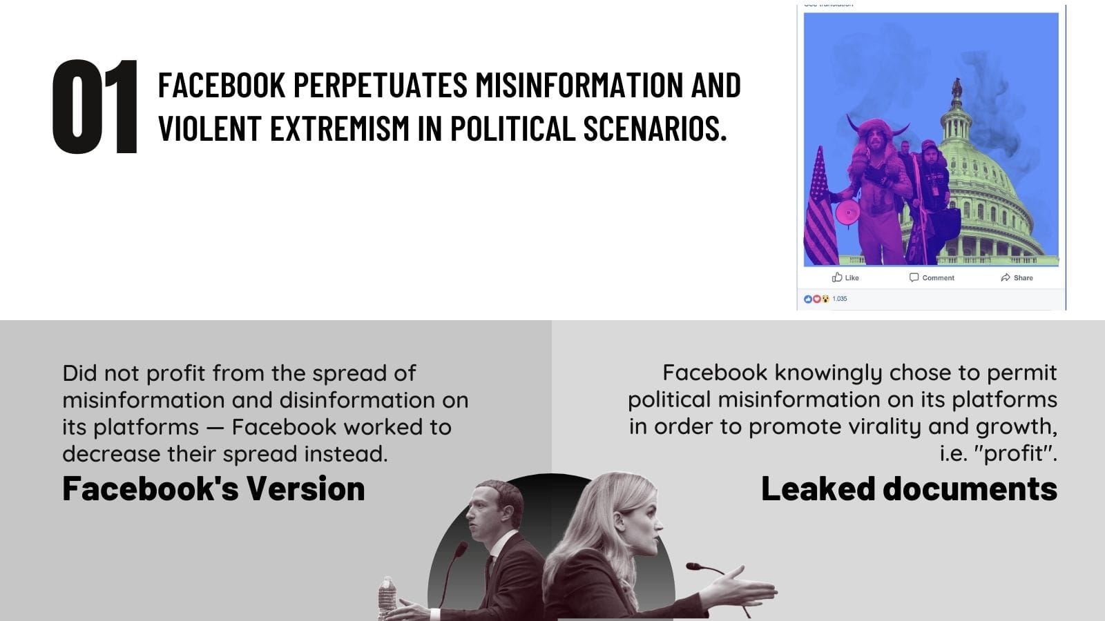 According to statements made by Facebook CEO Mark Zuckerberg before the United States Congress, Facebook has not profited from the spread of disinformation on its platforms, instead they have worked to reduce incentives for people to share misinformation to begin with. However, as per the original evidence submitted by Haugen to the US Securities and Exchange Commission’s Office of the Whistleblower, “Facebook’s records confirm that Facebook knowingly chose to permit political misinformation and violent content/groups and failed to adopt or continue measures to combat these issues, included as related to the 2020 US election and the January 6th insurrection, in order to promote virality and growth on its platforms”.