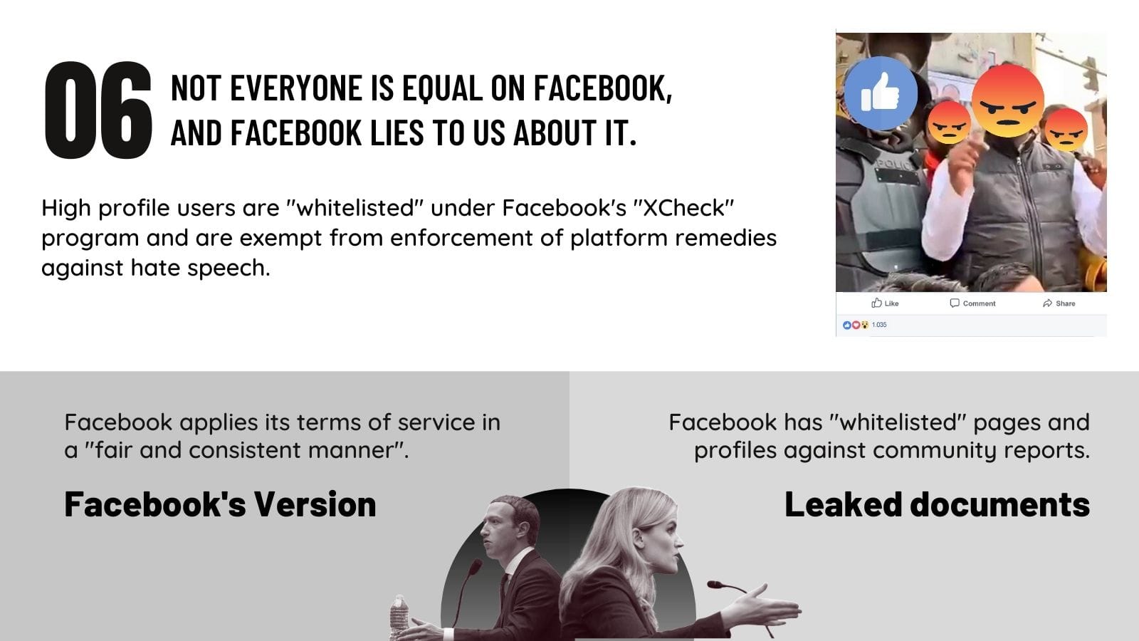 According to Zuckerberg’s sworn testimony before the US Congress, Facebook applies its terms of service in a “fair and consistent” manner. He further stated that, “(i)ncitement of violence is against our policy and there are not (sic) exceptions to that, including for politicians”. However, according to a document cited in the complaint, titled, “Whitelisting”, “over the years many XChecked pages, profiles and entities have been exempted from enforcement”.