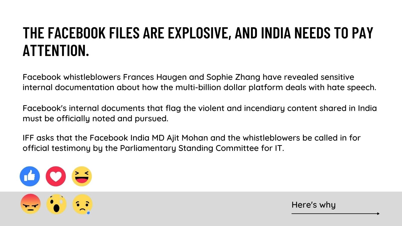 Two whistleblowers have revealed that Facebook is well aware of the real world harms it causes to its users and to democratic ideals worldwide, but it chooses to prioritise profit over doing the right thing. We wrote to the Parliamentary Standing Committee on Information Technology asking them to initiate an inquiry into the revelations made, specifically about India and to call the relevant stakeholders to testify before it.