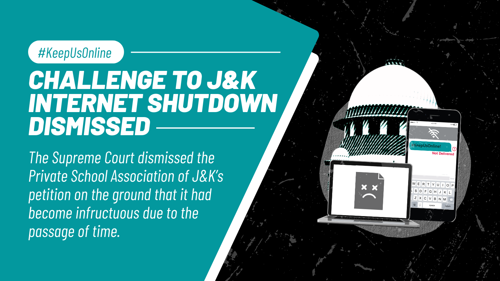 In 2020, the Union Territory of Jammu and Kashmir (“J&K”) issued several orders slowing down internet speed to 2G from 4G. Subsequently, the Union Territory frequently suspended the internet, without complying with directions of the Hon’ble Supreme Court in Anuradha Bhasin v. Union of India, (2020). With legal assistance from Internet Freedom Foundation (“IFF”), the Private School Association of J&K (Association), an association of over 3800 schools, approached the Supreme Court to challenge these orders, highlighting how the frequent suspension of internet services affects the right to education of students.