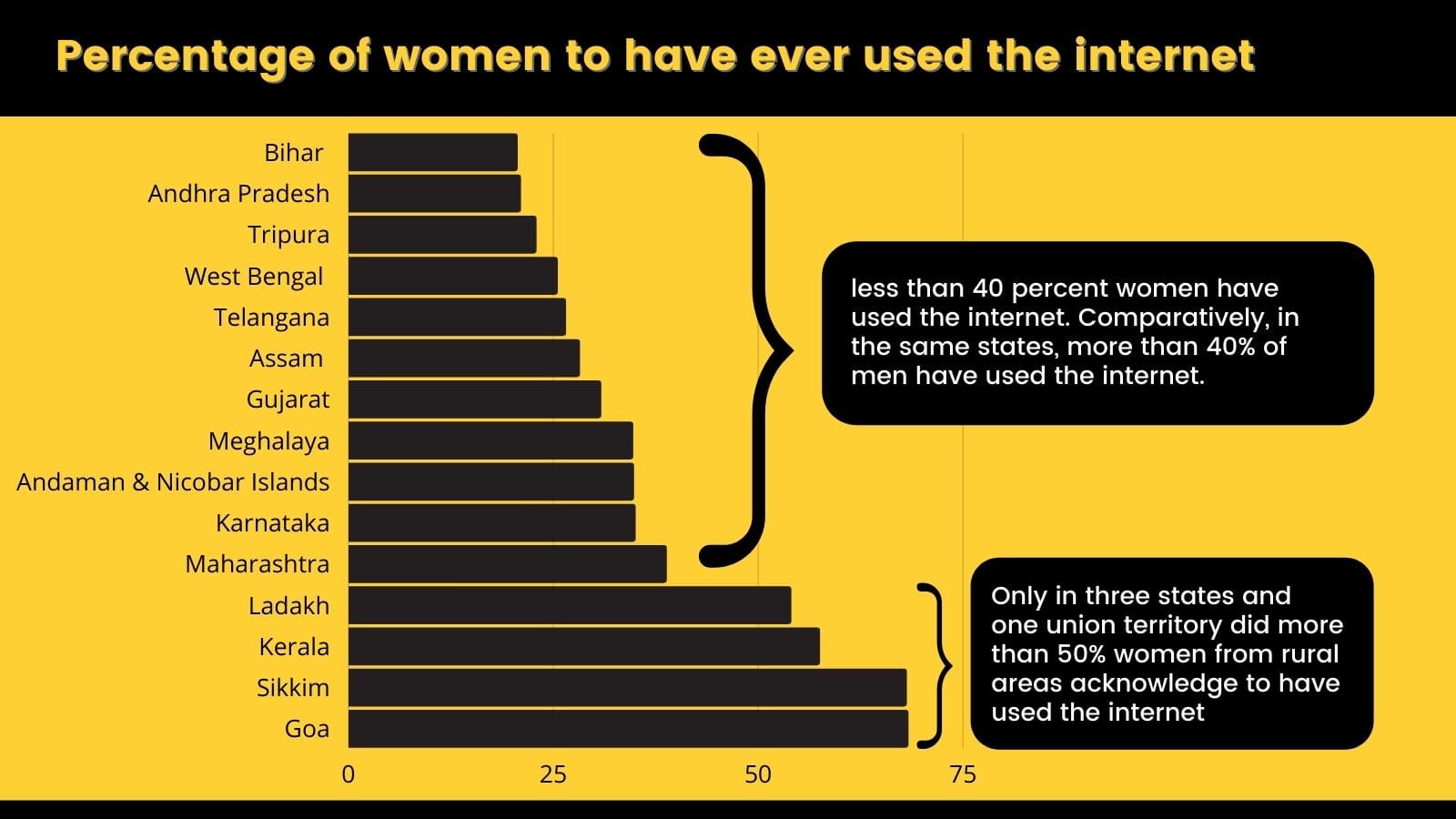 According to the 5th round of the National Family Health Survey (NFHS), in ten states and two union territories - Bihar (20.6%), Andhra Pradesh (21.0%), Tripura (22.9%), West Bengal (25.5%), Telangana (26.5%), Assam (28.2%), Gujarat (30.8%), Meghalaya (34.7%), Andaman & Nicobar Islands (34.8%), Karnataka (35.0%), Maharashtra (38.8%), and Dadra & Nagar Haveli and Daman & Diu (36.7%) - less than 40 percent women have used the internet. Comparatively, in the same states, more than 40% of men have used the internet. Only in three states and one union territory did more than 50% women from rural areas acknowledge to have used the internet - Goa (68.3%), Kerala (57.5%), Sikkim (68.1%), and Ladakh (54%).