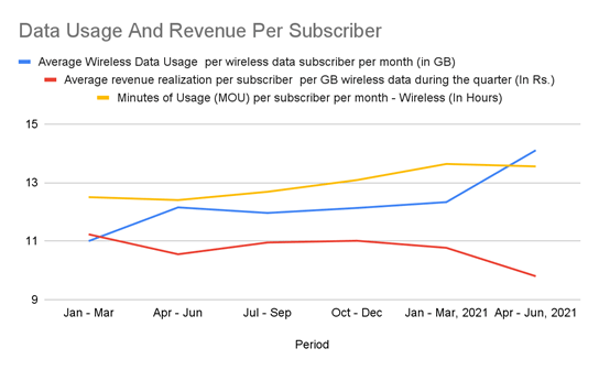 The Average wireless data usage per subscriber per month has increased to 14.1 GB in June 2021, as compared to 11 GB in March 2020, while the average minutes of usage per subscriber increased from 12.5 hours per month in March 2020 to 13.55 hours per month in June 2021.The Average revenue realization per GB wireless data has decreased to Rs. 9.8 in June 2021, from Rs. 11.23 in March 2020.