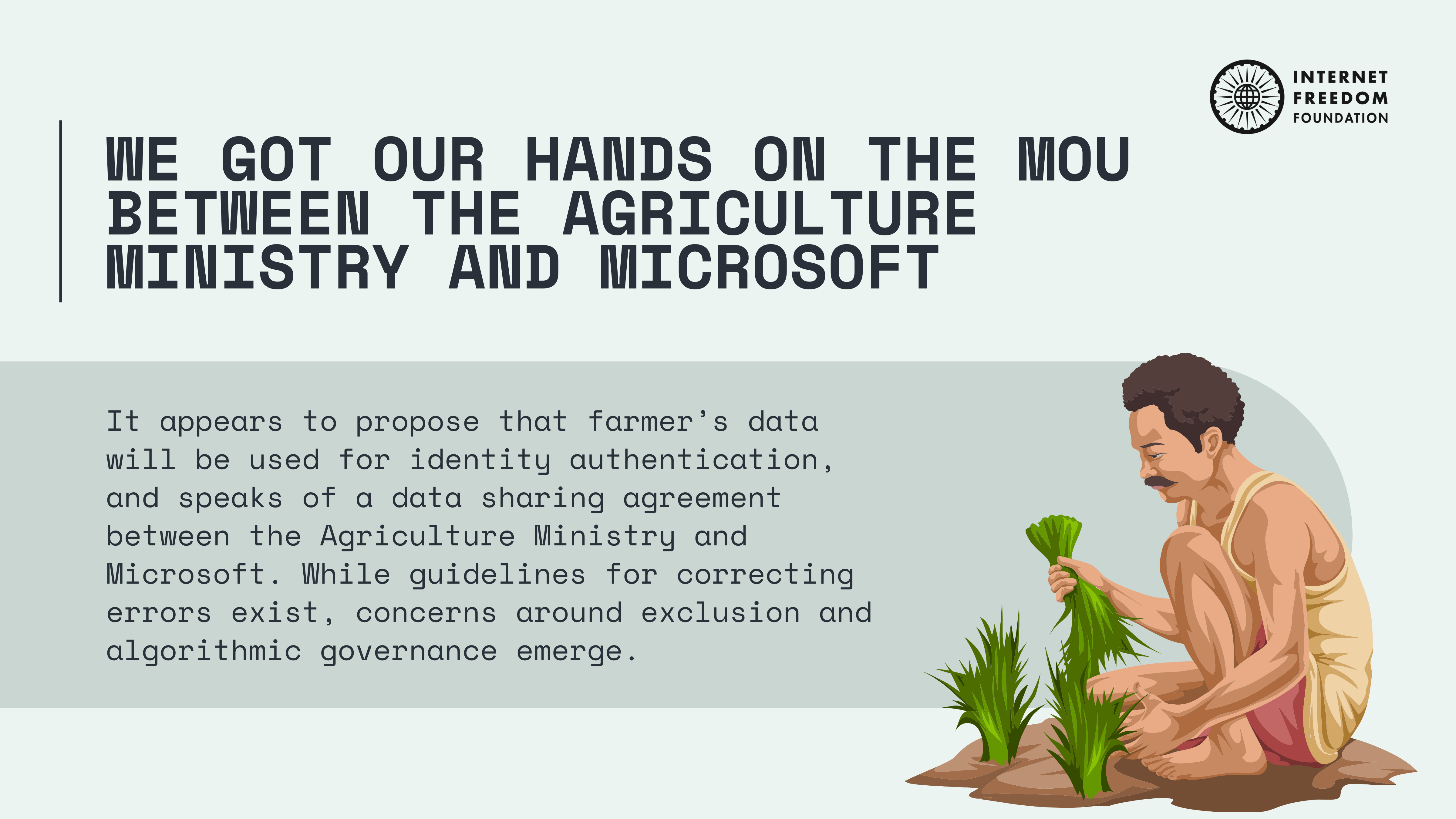 On 19th May, 2021, in response to an RTI query by us, the Ministry of Agriculture provided us a Memorandum of Understanding between the Department of Agriculture and Microsoft, and a document titled “Standard Operating Procedure (SOP) for verifying Farmer’s Database (100 Villages)”. The MoU appears to propose that farmer’s data will be used to authenticate their identity for the receipt of entitlements under agricultural schemes. Further, the MoU speaks of a data sharing agreement, wherein the Agriculture Ministry will share farmers’ data with Microsoft. While the SOP contains guidelines for correcting gaps and errors in land records concerns on data protection, exclusion to entitlements and algorithmic governance emerge.