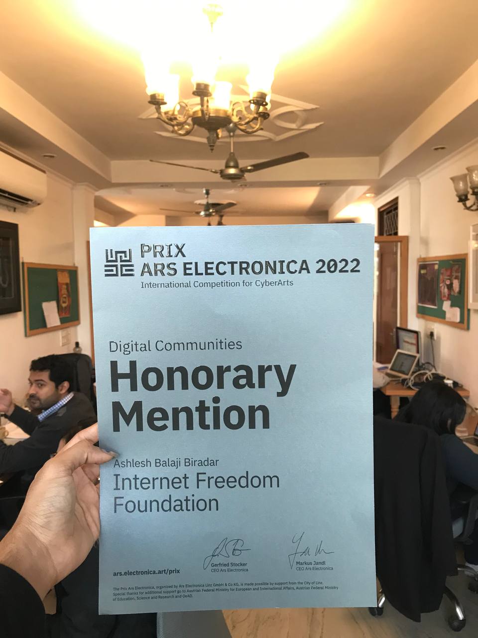IFF’s work on digital communities received an Honorary Mention in Prix Ars Electronica 2022. The award recognizes IFF's efforts of integrating culture with civic literacy and advocacy of digital rights in India, including our work on the cost of internet shutdowns in India, AI-enabled voice assistants and surveillance, and Pegasus, among other things.
