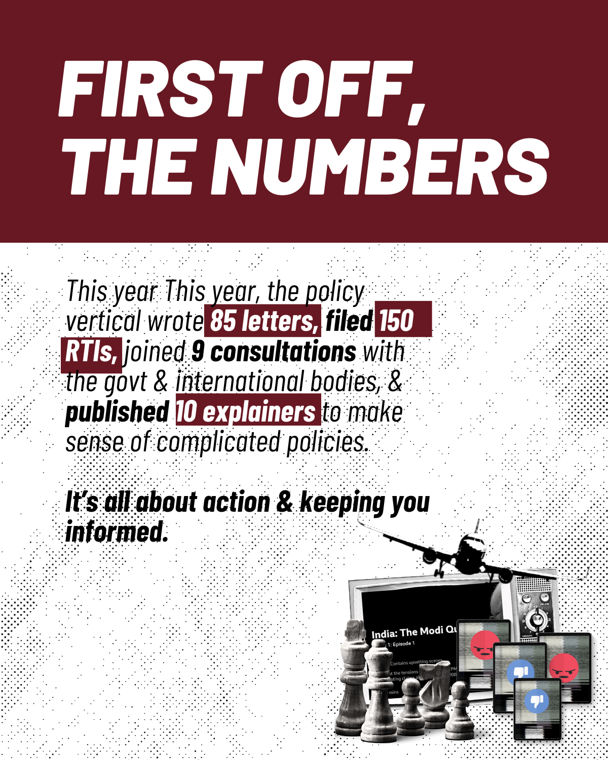 The policy team at IFF engaged in 9 consultations, sent 85 letters, and tracked 511 RTIs. Through persistent advocacy, we stopped the use of drones and facial recognition at polling stations during the 2024 elections and pushed the MIB to withdraw the revised Broadcasting Bill, 2024, with campaigns like #LetUsChill. We authored briefs, explainers, and summaries, collaborated with organizations, and deepened engagement with MPs to advance a secure digital environment for citizens. By simplifying complex issues through rapid responses, Twitter threads, and citizen campaigns, we sparked meaningful conversations. We are deeply grateful for our community’s support and remain committed to continuing this work. Read more about our year-long advocacy efforts in this blogpost.