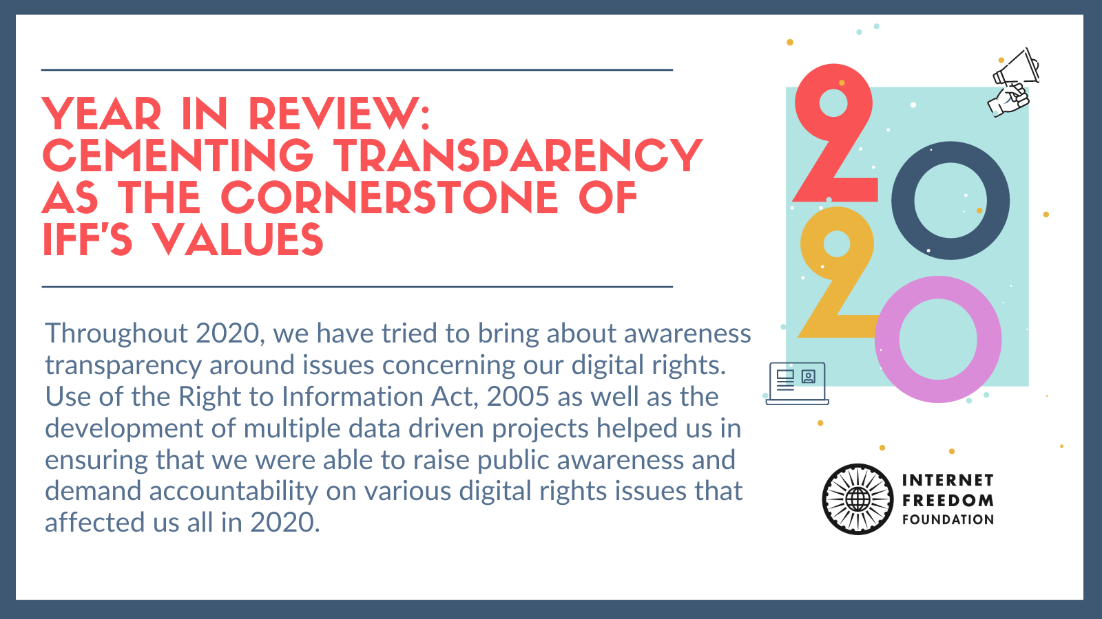 Throughout 2020, we have tried to bring about awareness and transparency to the various policies and projects that the Central and State government have developed and introduced. By utilising the Right to Information Act, 2005 as well as by way of two data-driven projects, we have tried to bring accountability in the working of every public authority. These transparency efforts are towards ensuring that the gap between the public and public policy can be bridged and more people get to engage in processes that set the digital frameworks that govern their present and future.