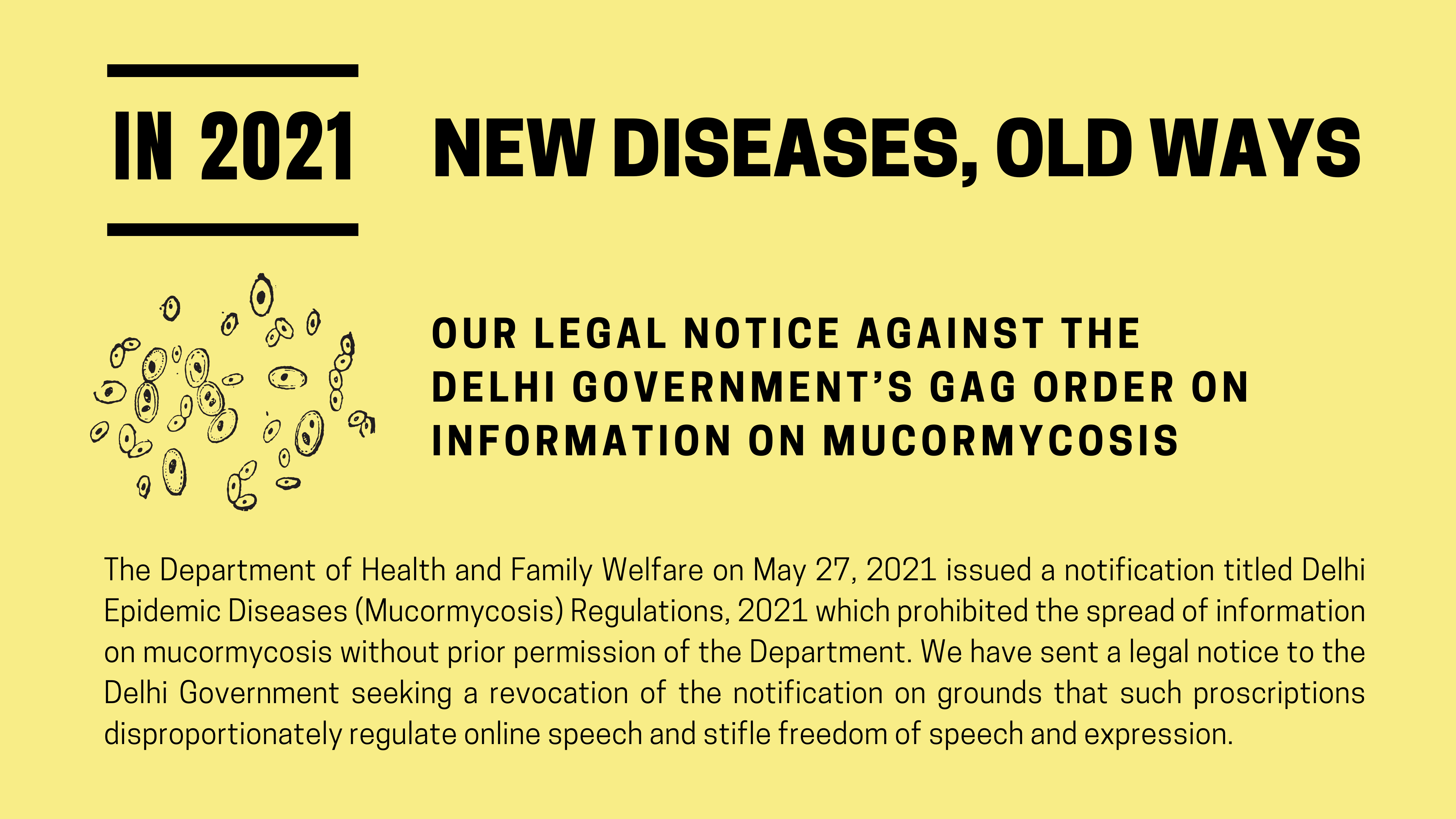 As India continues to reel under the scourge of the second wave of the fatal coronavirus outbreak, the country is confronted with yet another health hazard in the form of mucormycosis or “black fungus”. In this context, the Department of Health and Family Welfare, Government of NCT of Delhi (the Department) on May 27, 2021 issued a notification titled Delhi Epidemic Diseases (Mucormycosis) Regulations, 2021 which prohibited individuals or organisations from spreading “any information on mucormycosis without prior permission of the Department”. We have sent a legal notice to the Government of NCT of Delhi, seeking a revocation of the notification on grounds that such proscriptions disproportionately regulate online speech and stifle freedom of speech and expression.