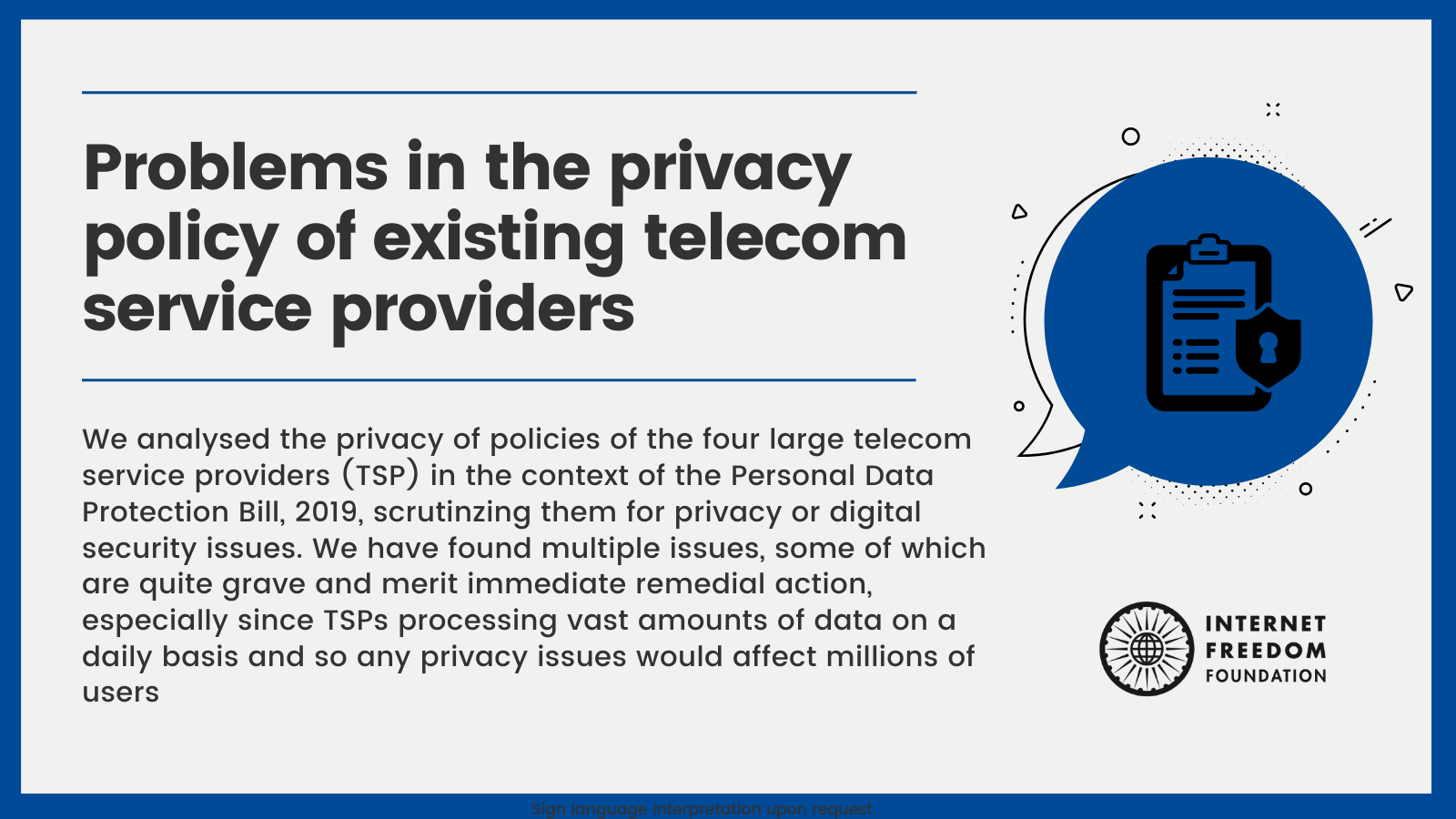 We analysed the privacy of policies of the four large telecom service providers - Jio, Vi, Airtel, and BSNL - to check not only whether they were Puttaswamy-compliant, but also whether their policies would need updating in the face of the impending Personal Data Protection Bill, 2019. We found certain issues in these policies, on the basis of which we have sent letters detailing our comments to these telecom service providers.