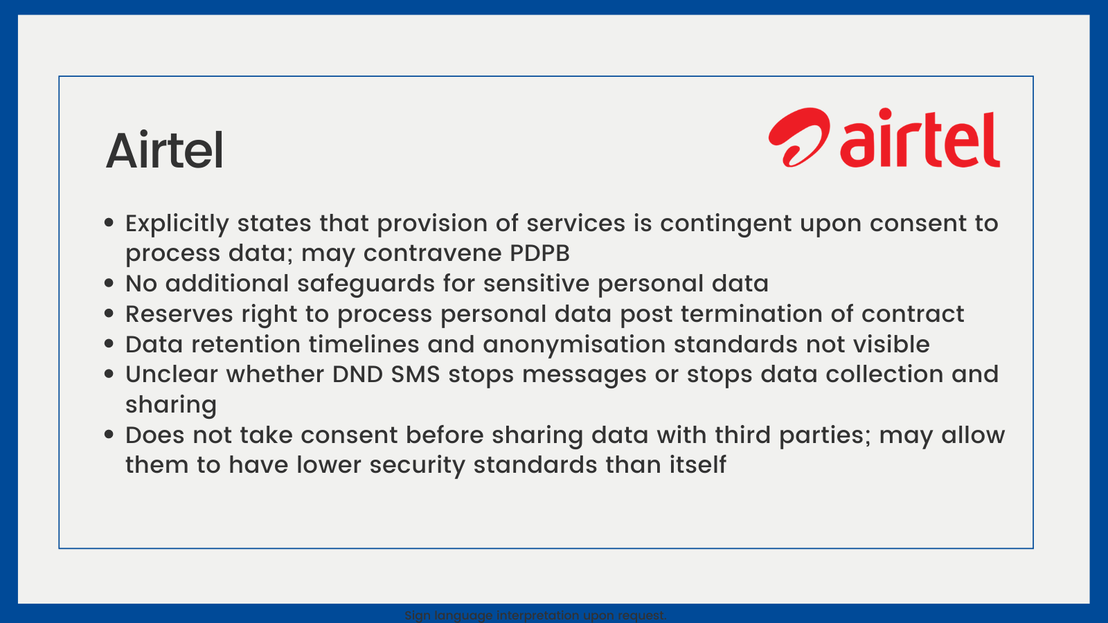 The PDPB also mandates certain additional safeguards for the processing of sensitive personal data, which are missing in the policy. Additionally, the policy states that Airtel may still have lawful grounds to process personal data once a user’s contract with Airtel has been terminated, even though the PDPB preserves the right to erasure. Data retention timelines and data anonymisation standards are missing from the policy as well.