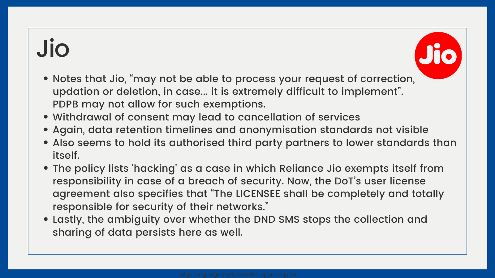 As might be expected, Jio's privacy policy also has multiple issues. The policy notes that Reliance Jio, “may not be able to process your request of correction, updation or deletion, in case... it is extremely difficult to implement”. The PDPB explicitly acknowledges the right to forgotten, and so it may not allow exemptions due to ‘technical difficulties’. The privacy policy also states that “withdrawal of consent may lead to cancellation of your registration with us or your access to our services”. Additionally, even though the Consumer Acquisition Form states that certain fields are optional, the policy does not make it clear whether a refusal or withdrawal of consent of optional fields would also result in the termination of services. Once again, the need for a new consent sharing paradigm for TSPs is demonstrated.