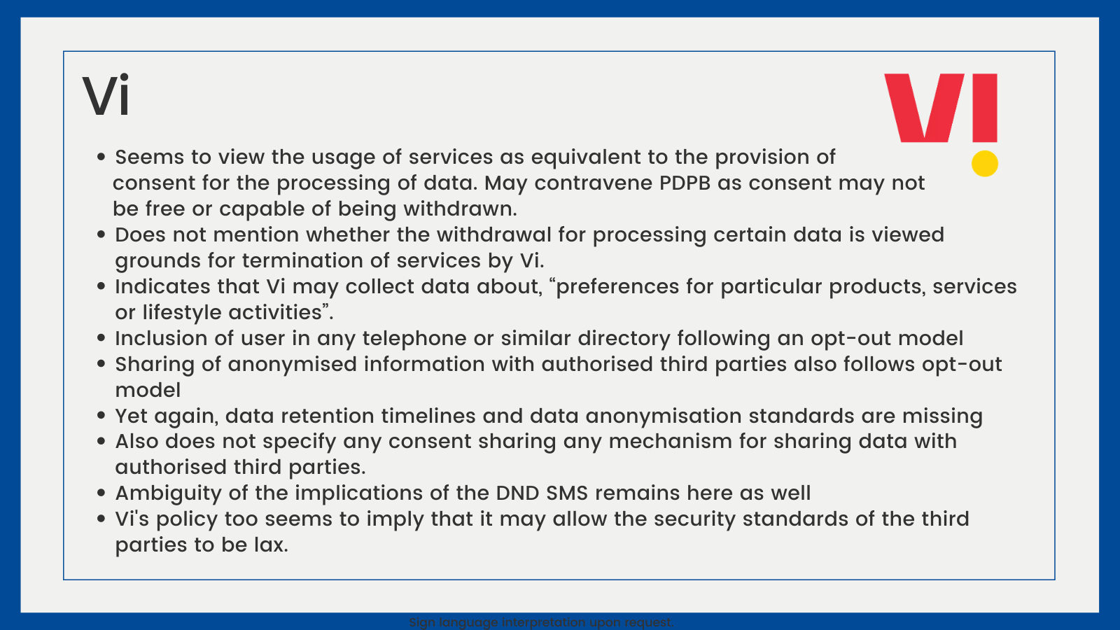 In an Airtel-esque gaffe, Vi's privacy policy also seems to indicate that Vi may collect data about, “preferences for particular products, services or lifestyle activities”. This seems to be a textbook example of function creep, and the inclusion of such a clause is even more surprising given the recent furore faced by Airtel. The policy also states that one of the uses of personal data is “Inclusion in any telephone or similar directory or directory enquiry service provided or operated by us or by a third party”. If the collection of certain types of data is indeed mandatory for the use of services (as is implied, then this would then imply that inclusion in a directory follows the ‘opt-out’ model. An opt-out model has also been prescribed for the sharing of anonymised information with authorised third parties. Both of these would seem to contravene the directive laid down by the PDPB for the explicit provision of consent.
