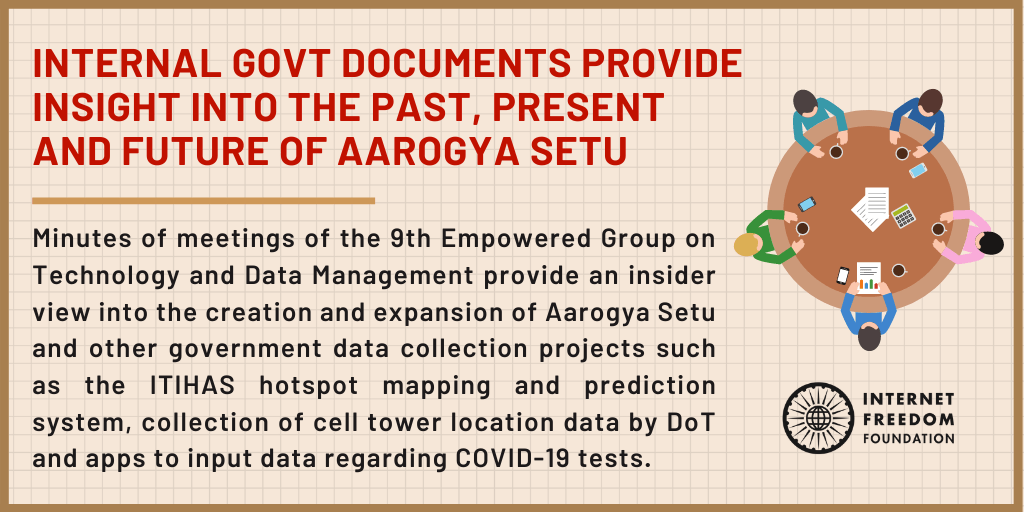 Minutes of meetings of the 9th Empowered Group on Technology and Data Management provide an insider view into the creation and expansion of Aarogya Setu between 31 March 2020 to 10 August 2020. These documents were obtained by IFF through the Right to Information Act, 2005 and they contain information about several projects including the Aarogya Setu proximity exposure notification app, the ITIHAS hotspot mapping and prediction system, collection of cell tower location data by the Department of Telecom, and apps to input data regarding RT-PCR and antigen tests.