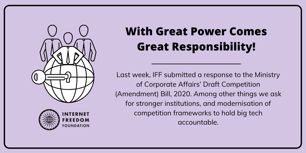 IFF shared a response with the Ministry of Corporate Affairs on its draft Competition (Amendment) Bill, 2020 which was put out for public consultation last month. We suggest ways in which the Government could strengthen and streamline its institutions within India’s competition framework. More importantly we stress on the need for India’s competition laws to be modernised to reflect challenges emerging from market concentration in technology markets. We look at it through the prism of innovation, consumer welfare and human rights dimensions. We also flag our concerns with certain insertions in the draft amendment. Additionally, we suggest certain additions/changes to help adapt the role of competition frameworks to modern digital markets.