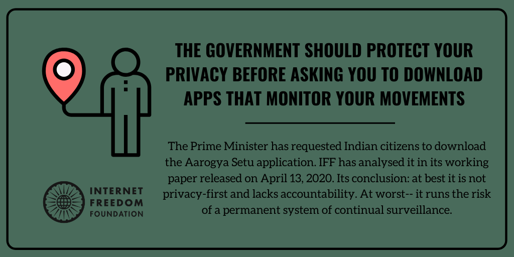 In today’s speech announcing the extension of India’s national lockdown till 3rd May, 2020 the country’s Prime Minister requested citizens to download the Aarogya Setu application. Unfortunately, the application remains a privacy minefield and it does not adhere to principles of minimisation, strict purpose limitation, transparency and accountability. IFF’s Working Paper, analyses the application, highlights how it is inconsistent with the right to privacy, is conceivably a risk toward a permanent system of mass surveillance, and suggests clear recommendations to arrest these risks.