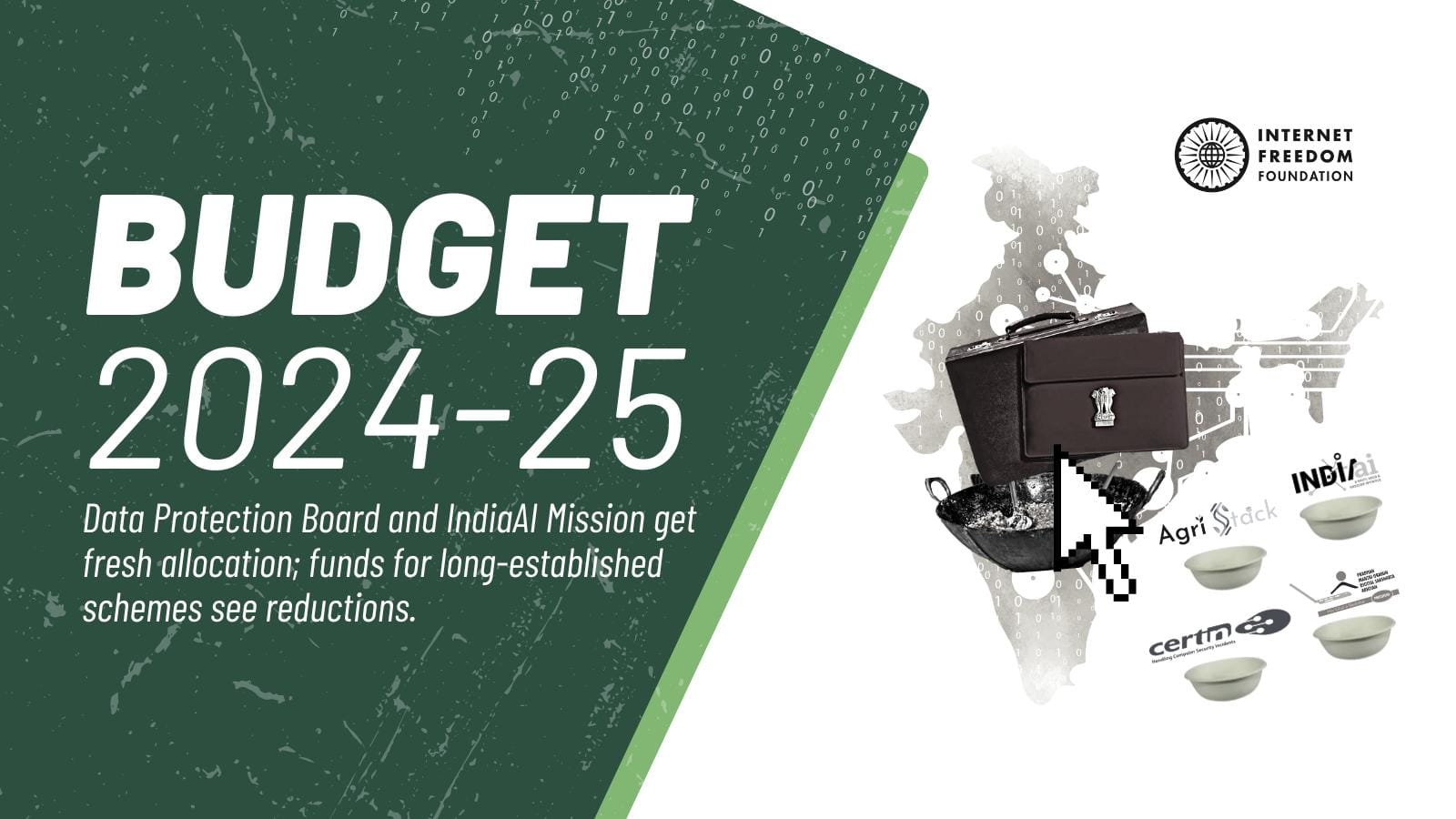 The most notable change in the Budget for 2024-2025, which has direct implications for digital rights, has to be the allocation of ₹2 Cr for the Data Protection Board (“DPB”). After a long and arduous journey for data protection legislation, it is disappointing to see funding of a mere ₹2 Cr for a regulatory body whose functioning will have a direct impact on the implementation of the Digital Personal Data Protection Act (“DPDPA”), 2023, successful or otherwise. Of this ₹2 crore, only ₹4 lahks is reportedly allocated for capital expenditure, which includes fixed assets such as the digital portal, and the rest (₹ 1.96 Cr) is allocated for revenue expenditure (salaries, etc). Since it is unclear when the DPB will become functional, it is difficult to ascertain whether the allocated budget is meant to be utilised for the entire financial year or a part of it. Either way, a minuscule amount of ₹4 lakhs for capital expenditure on DPB may prove to be insufficient for upskilling and training of the DPB members. In the following Budgets, we hope MeitY ensures that it is adequately resourced for the institutional preparation of the DPB. Adequate funding for key regulatory bodies such as the DPB will contribute to its independent functioning which is necessary to keep checks and balances on the executive.