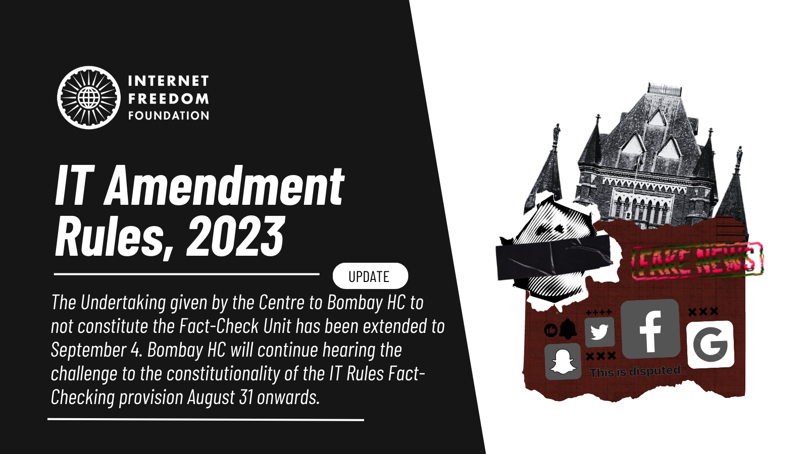 The Ministry of Electronics and Information Technology (MeitY) notified the Information Technology (Intermediary Guidelines and Digital Media Ethics Code) Amendment Rules, 2023 (IT Amendment Rules, 2023) on April 6, 2023. These rules include a provision that permits a "fact check unit of the Central Government" to determine the falsity or misleading nature of any online content related to the "business of the Central Government" and demand its removal from the internet. Mr. Kunal Kamra, a political satirist and standup artist, the Editors Guild of India, and the Association of Indian Magazines have filed writ petitions before the Bombay High Court challenging the constitutionality of this provision. The Petitioners have now concluded their submissions, and the undertaking given by the Union Government to the Court to not constitute a Fact-Check Unit in the interim has been extended to September 4, 2023. IFF has provided legal assistance in the matter to Kunal Kamra as well as the Association of Indian Magazines.