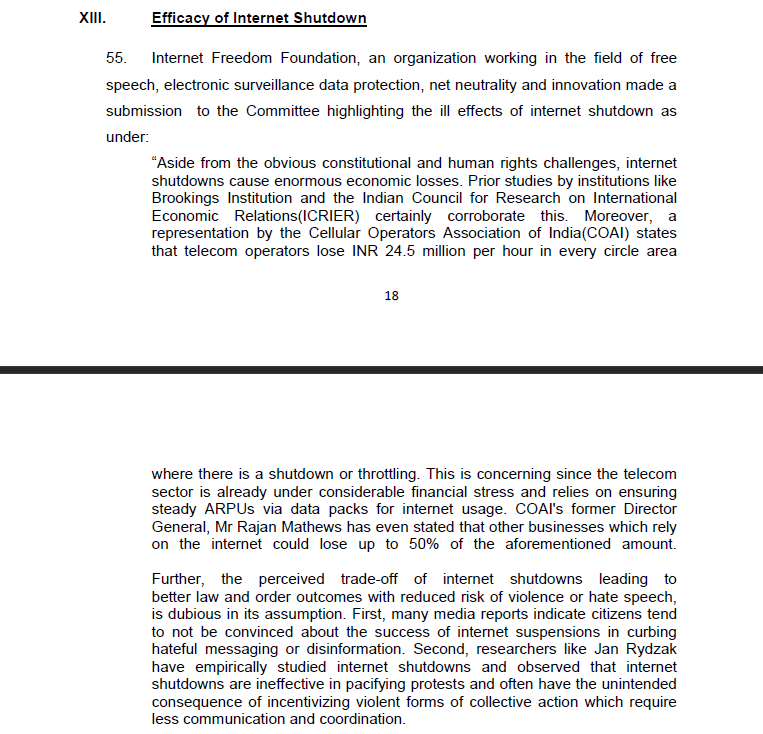 In the report, the Committee has noted the responses of the authorities. Incidentally, the Committee has also noted the submissions made by IFF on 4th August, 2020 highlighting the ill effects of internet shutdowns. In our submissions, we had questioned whether internet shutdowns lead to better law and order outcomes, and had pointed out that research had demonstrated that internet shutdowns were ineffective in pacifying protests and have the unintended consequence of incentivising violent forms of collective actions which require less communication.