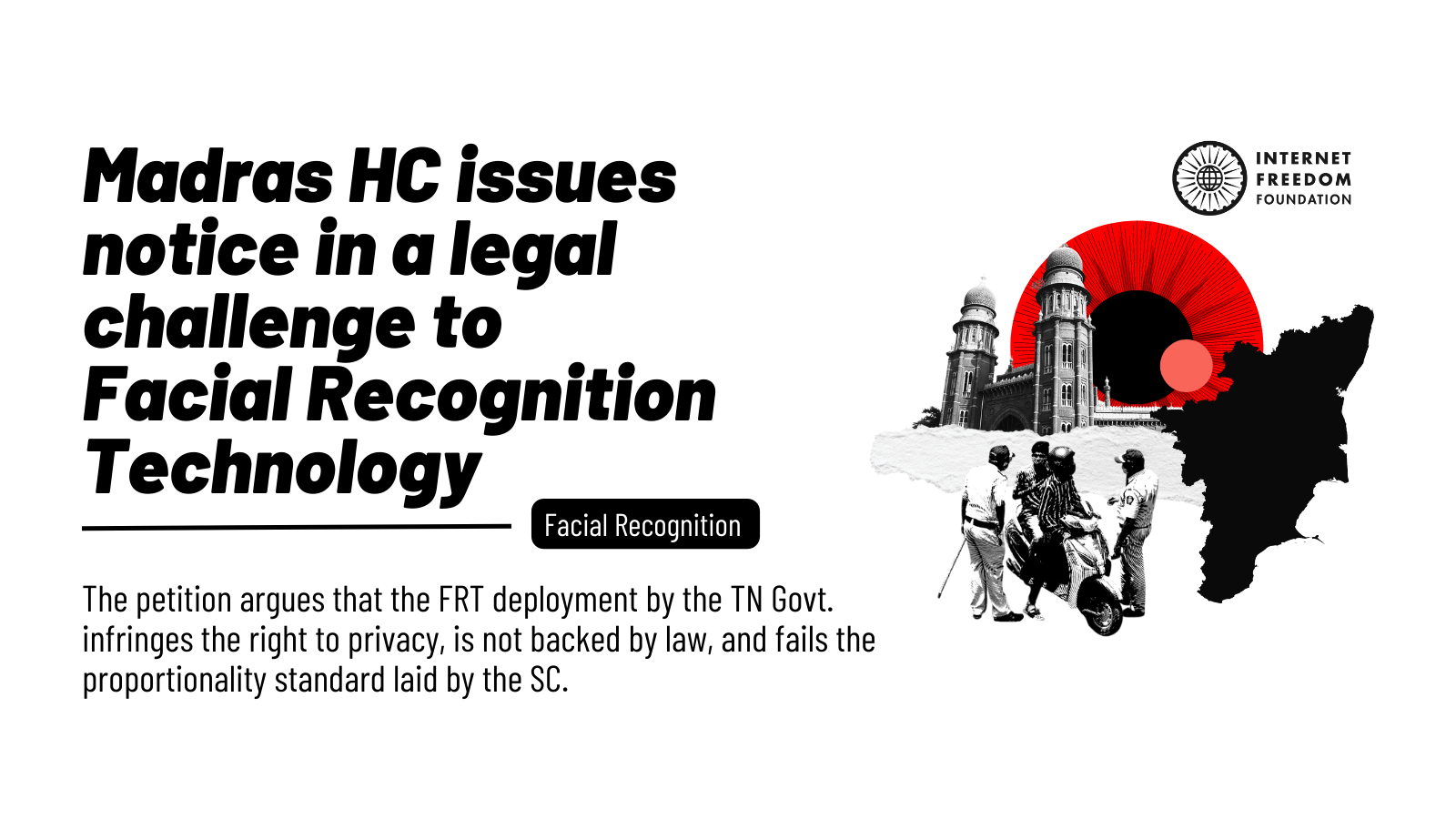 The Madras High Court has issued notice in a petition filed by Mr. Akhilesh Kumar Kandasamy, a long-term resident of Chennai, challenging the installation and deployment of Facial Recognition Technology (“FRT”) across the State of Tamil Nadu and specifically within the city of Chennai. Notice was accepted by the Counsel for the Tamil Nadu government. In his petition, Mr. Kandasamy argues that the deployment of FRT in Tamil Nadu is through covert and non-consensual means, is without any statutory basis, and does not provide the citizens–subject to this intrusive surveillance–information about how their sensitive personal data is being stored, shared and used. The petition argues that the FRT deployment by the Tamil Nadu government infringes the right to privacy, is not backed by law, fails the proportionality standard laid by the Supreme Court, and is discriminatory at its core.