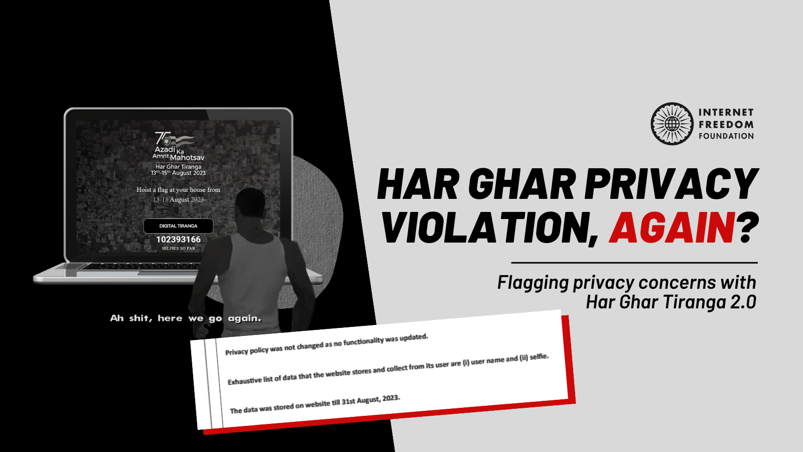 We at IFF remain firm believers in institutional processes, and strongly hope that the Ministry of Culture remains cognisant of the fundamental right to privacy of Indian citizens. Last year after our representations, the website removed the restriction of logging in using only either Google single sign-on (SSO) or a combination of their name and phone number functionality, which unnecessarily collected user data. This was a positive step towards data minimisation. This year as well, we urge the Ministry to delete all user data once the campaign has concluded, and to issue a public statement, either through a disclaimer on the website or a press release, stating that all data has been deleted and that it has not been shared with any third party(s) or put to any other use.