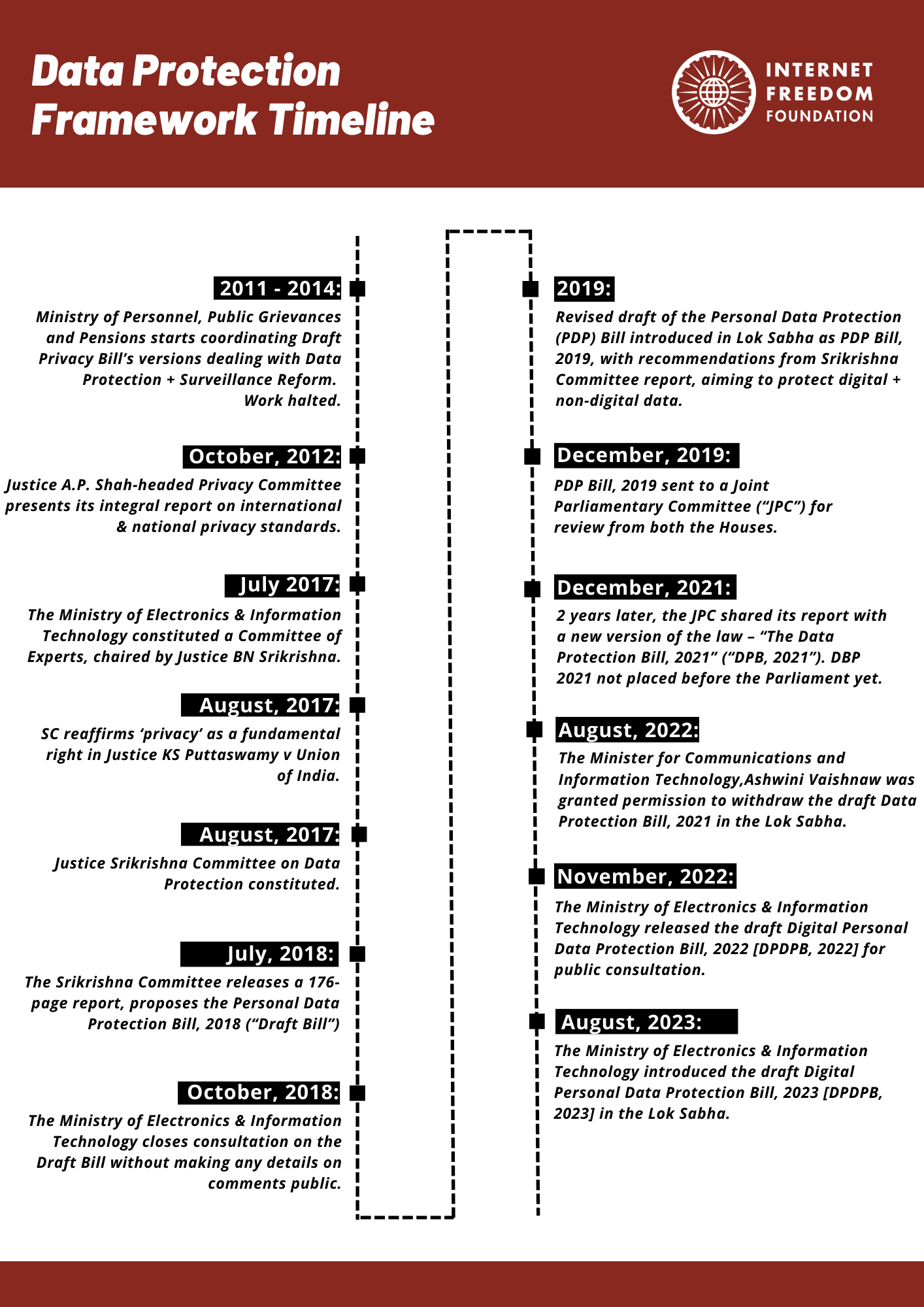 An Expert Committee on Privacy headed by Justice A.P. Shah under the erstwhile Planning Commission presented a report on October 12, 2012 which serves as an influential document on international & national privacy standards.The Expert Committee on Data Protection chaired by Justice BN Srikrishna was constituted by the Ministry for Electronics and Information Technology (“MeitY”) on July 31, 2017. The Committee released its 176 page Report to the MeitY and proposed the Personal Data Protection Bill, 2018 on July 27, 2018. As soon as the Personal Data Protection Bill, 2019 (“PDPB, 2019”) was introduced in the Parliament on December 11, 2019, it was sent to a Joint Parliamentary Committee (“JPC”) with members from both the Houses for its review and suggestions. After nearly two years and several extensions, the Joint Committee on the Personal Data Protection Bill, 2019 brought out its report on December 16, 2021. The Report also contained a new version of the law titled, “The Data Protection Bill, 2021” (“DBP, 2021”). However, the DPB, 2021 was withdrawn by the Minister for Communications and Information Technology, Ashwini Vaishnaw on August 3, 2022. The Ministry of Electronics & Information Technology released the draft Digital Personal Data Protection Bill, 2022 (DPDPB, 2022) on November 18, 2022 for public consultation. The notice accompanying the DPDPB, 2022 stated that submissions made as part of the consultation process will not be made public.