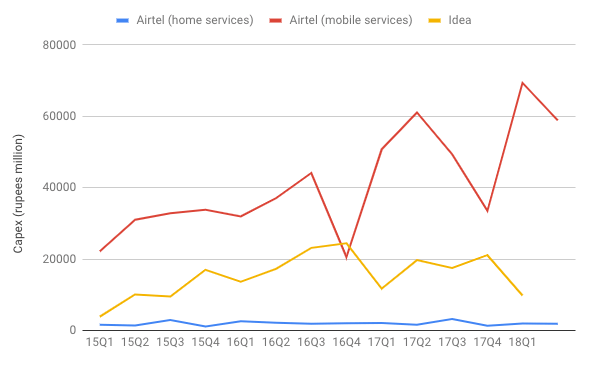 At the same time there are other independent programs specific to telecom players such as Airtel's Project Leap announced in 2016 with a plan for an investment of 600,000 million rupees over the next three years. So far the gross capex is Rs. 387,546 mil, and a year's left. Airtel also has a capex forecast of Rs. 250,000 mil for this year of which it is roughly halfway there at Rs. 128,213 mil. Vodafone Idea (not just Idea -- the merged entity) has a capex guidance for Rs. 270,000 mil for the next year.