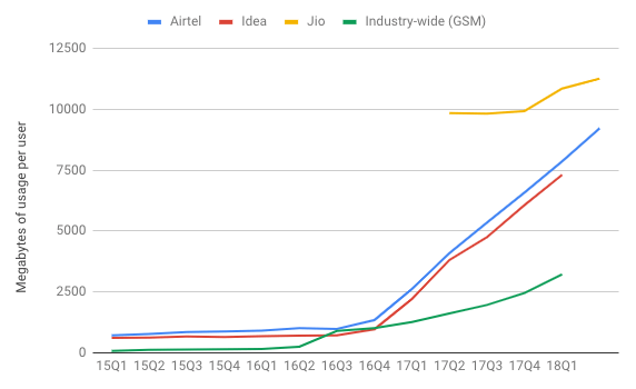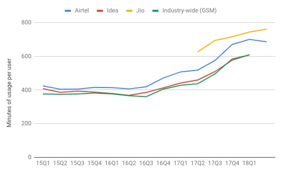 It is again important to consider that the numbers change drastically after Jio’s launch in 16Q2. Industry-wide ARPU saw a year-on-year increase of 5% for 16Q2, a quarterly decline of 15% by 16Q3, and a year-on-year 33% decline for 17Q2.