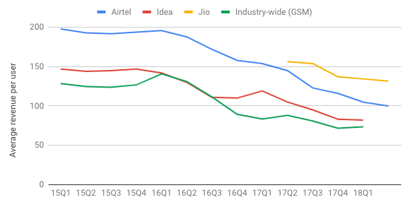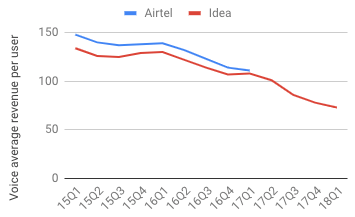The fall (quarter-on-quarter, of 15% for Airtel and 14% for Idea) in 17Q3 is to a large extent attributable to TRAI reducing the interconnect usage charges from 14 paisa to 6 paisa. In their quarterly reports, Airtel says this accounts for an 11% fall in ARPU.