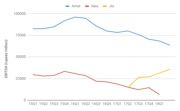 As with everything prior, there is a noticeable change in trends around 16Q2 (when telcos started aggressively pricing their plans and providing unlimited voice bundles with data plans). As with ARPU, the fall (quarter-on-quarter, of 11% for Airtel and 19% for Idea) in 17Q3 is to a large extent attributable to the reduction in the interconnect usage charges. In their quarterly reports, Airtel says this accounts for a 4% fall in EBITDA, while Idea says this accounts for a 15% fall in EBITDA.