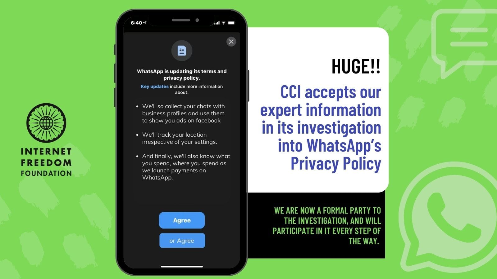 In the Competition Commission of India’s (CCI) suo moto investigation into potential anti-competitive practices, we have submitted expert information before the Director-General in charge of the investigation. In our information, we have highlighted how WhatsApp has a dominant position in its relevant market, and how WhatsApp’s 2021 Privacy Policy abuses such dominant position. On October 12, 2021, the CCI issued an order tagging the information with the ongoing investigation. As a result, we are now a formal party before the Director-General and will participate as such in the investigation proceedings. This is a huge opportunity to present the user’s point of view to the Commission!